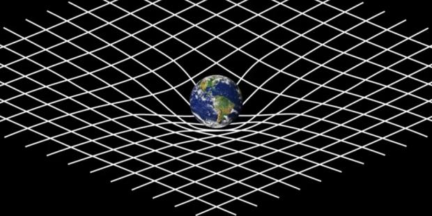 Гравітація, за Ейнштейном, виникає через викривлення простору-часу великими масами. Уявіть кулю для боулінгу на натягнутій гумовій тканині — вона прогинає її, а менш масивні предмети, як м’ячик для пінг-понгу, котяться до центру. Це і є гравітація.
