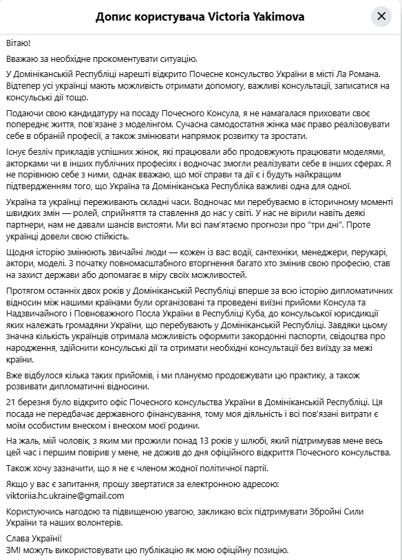 21 березня відкрили офіс Почесного консульства України в Домініканській Республіці. Новою почесною консулкою стала Вікторія Якимова. Її призначення викликало активне обговорення, оскільки зазвичай на такі посади призначають осіб із широкими політичними або бізнесовими зв’язками.