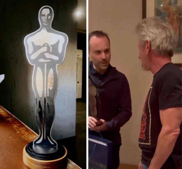 "Ось, що означає Ваша присутність тут. Ви пропускаєте церемонію вручення "Оскара". Тому ми зробили це. До того ж, Ви подарували останню статуетку президенту. Тож ми зробили цю. Вона зроблена з вагона, пошкодженого росіянами. Ви сказали, що метал вцілів, тож ми викарбували тут кілька слів, які для нас мають особливе значення. Він не золотий, але дуже справжній. І від щирого серця. Він важливий для нас", - сказав він.