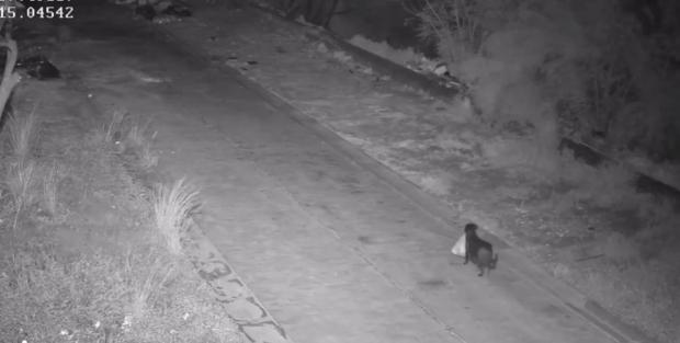 На відео видно, як хитрий пес несе великий пакет зі сміттям у зубах і обережно залишає його на узбіччі дороги. Там утворилося стихійне сміттєзвалище. Сам відеоролик було знято пізно ввечері.