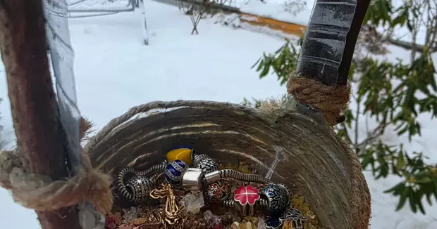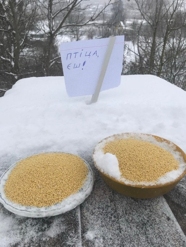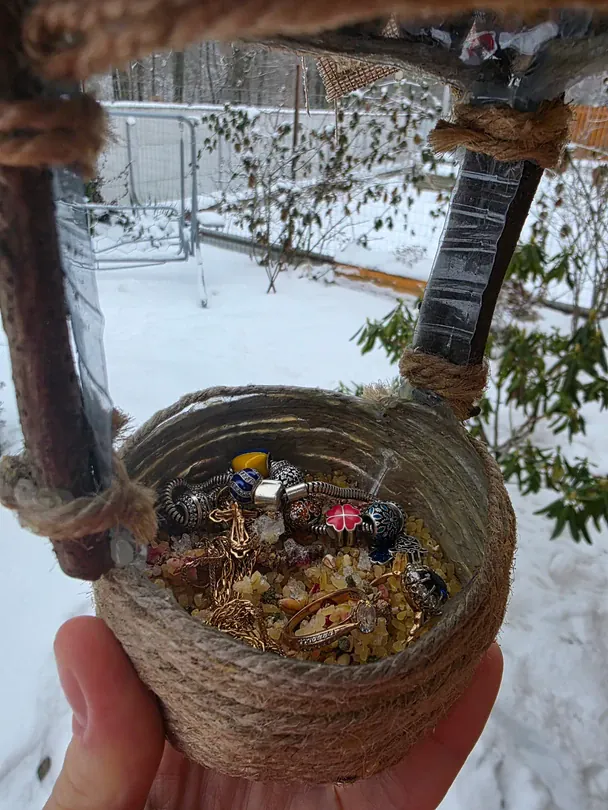 На опублікованих світлинах видно саморобну годівничку, у якій серед круп і насіння лежать металеві прикраси. Імовірно, птахи — зокрема сороки або ворони — могли принести блискучі предмети, приймаючи їх за щось цінне.