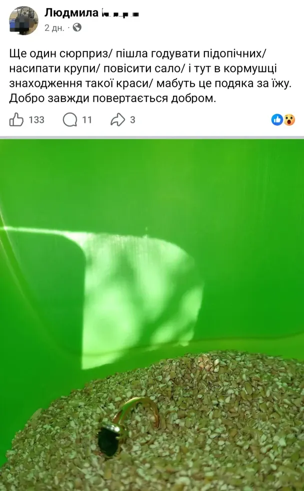 Несподівана «подяка» від птахів стала справжньою сенсацією в українському сегменті соцмереж. Жінка опублікувала фото в Threads, на якому видно годівничку, наповнену не лише зерном, а й прикрасами — каблучками, ланцюжками та підвісками.