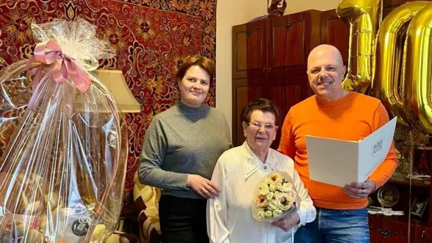 Відтак вже традиційно працівники міського управління соціального захисту вручили ювілярці вітальний лист від міського голови, памʼятну монету Короля Данила, 10 000 грн матеріальної допомоги та "Кошик довголіття" з букетом квітів.