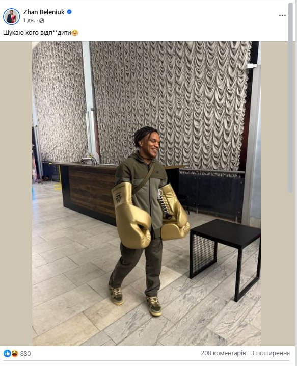 Український спортсмен і нардеп Жан Беленюк 13 жовтня розмістив у Facebook фото, на якому його зафіксовано в гігантських боксерських рукавичках золотистого кольору, передають Патріоти України.