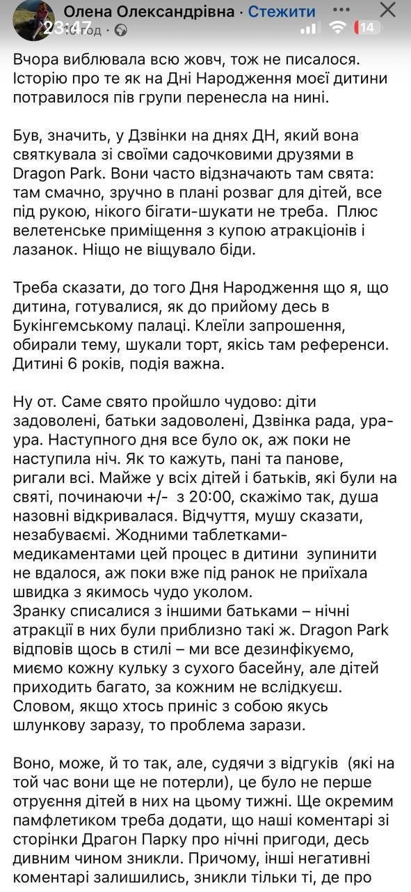 Скарги на погане самопочуття від відвідувачів парку розваг почали надходити наступного дня після відвідин закладу. «Історію про те, як на дні народження моєї дитини потравилося пів групи, перенесла нині…» — написала мама дівчинки Дзвінки в соцмережі.