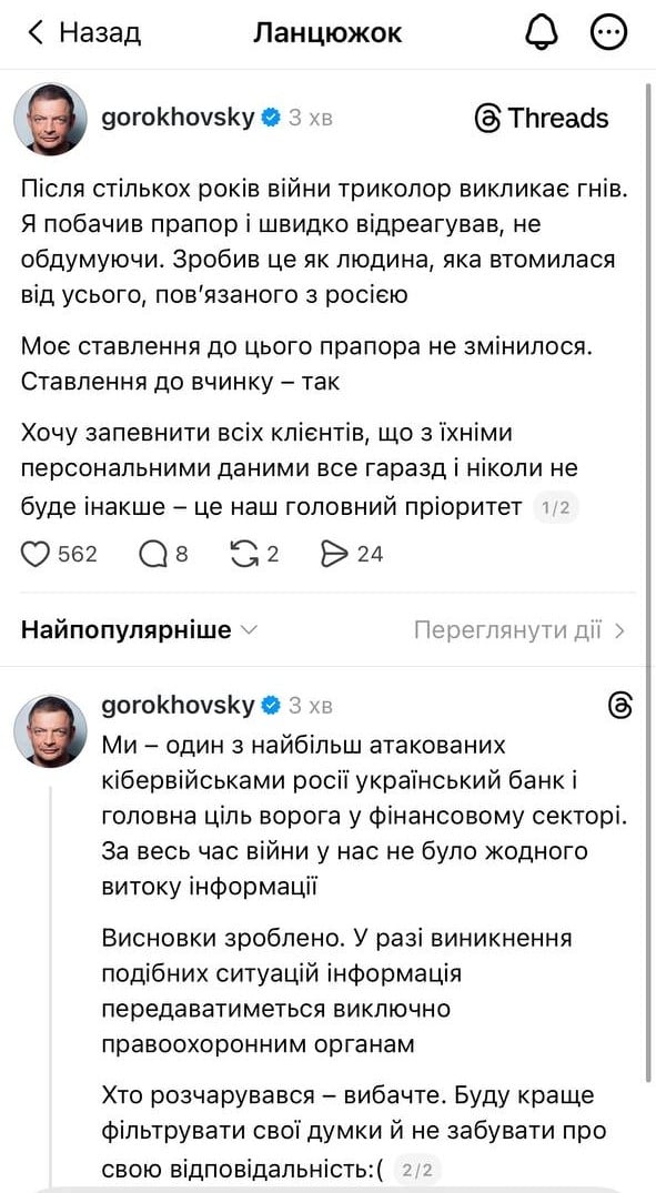 Засновник українського банку Monobank Олег Гороховський після скандалу з фото клієнтки, яку він звинуватив у проросійських поглядах, видалив те фото зі своїх соцмереж і попросив вибачення у тих, кого "розчарував". Відповідний допис він опублікував у соцмережі Threads 11 березня, передають Патріоти України.