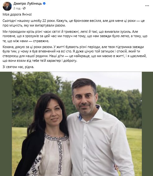 Дмитро Лубінець святкує з дружиною бронзове весілля. Посадовець звернувся з привітаннями до коханої та висловився про їхній шлюб. «Моя дорога Яніно! Сьогодні нашому шлюбу 22 роки. Кажуть, це бронзове весілля, але для мене ці роки – це про міцність, яку ми вигартували разом. Ми проходили крізь різні часи: світлі і тривожні, легкі й такі, що вимагали зусиль. Але головне, що я зрозумів за цей час: ми поруч не тому, що нам завжди було легко, а тому, що те, що між нами – справжнє», – йдеться в дописі.