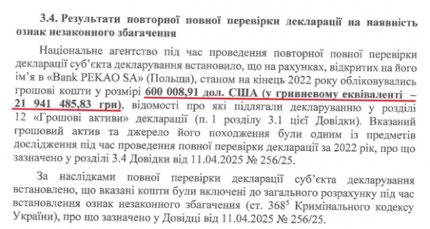 Під час першої перевірки НАЗК не змогло підтвердити наявність рахунку у польському банку, оскільки відповідні дані не були доступні агентству. Лише після отримання інформації від НАБУ, яке залучили у межах досудового розслідування, вдалося підтвердити факт існування депозиту на понад пів мільйона доларів. Саме ця деталь і стала ключовим «новим доказом» у повторній перевірці.