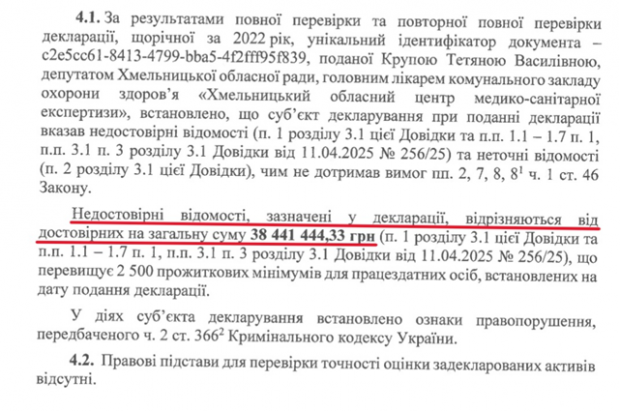 Антикорупційне агентство дійшло висновку, що ці кошти мають ознаки незаконного збагачення, передбаченого статтею 368-5 Кримінального кодексу. Крім того, загальна сума недостовірних відомостей у декларації за 2022 рік Крупи склала 38,44 млн грн, що більш ніж у 2,5 тисячі разів перевищує прожитковий мінімум для працездатних осіб. Це свідчить про ознаки кримінального правопорушення, передбаченого ч. 2 ст. 366-2 ККУ – умисне декларування завідомо неправдивих відомостей.