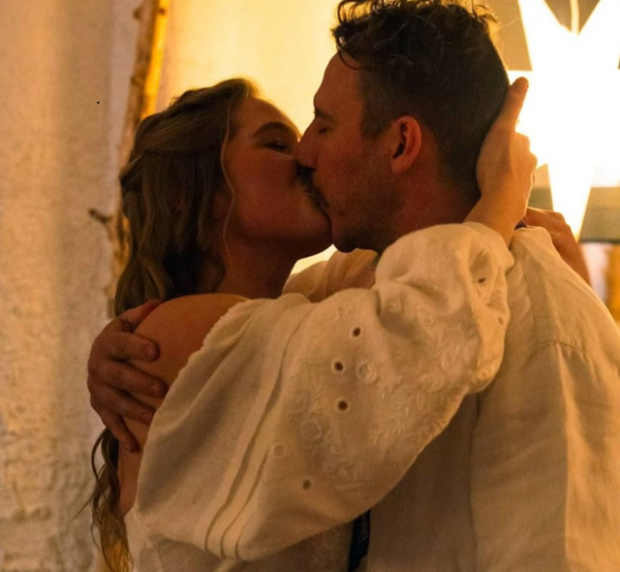 Катерина теж обрала образ в етностилі — ніжну сукню, що гармонійно доповнила атмосферу моменту. Коли Євген надягав каблучку їй на палець, з її обличчя не сходила щира усмішка — та сама, яку неможливо зіграти.
